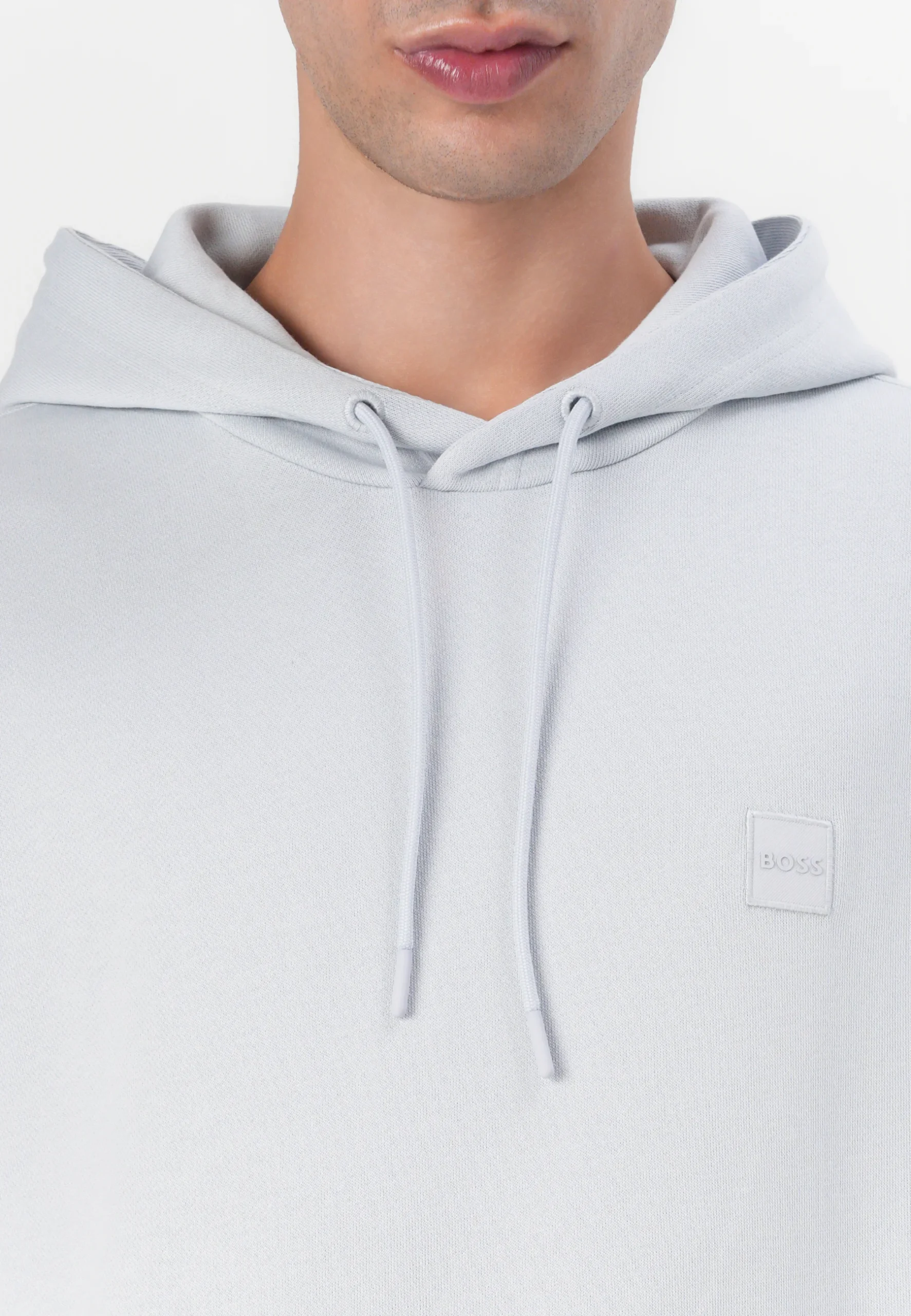 Hanorac original Hugo Boss, culoare alb, cu logo discret aplicat pe piept, oferind un loc minimalist, elegant și premium.