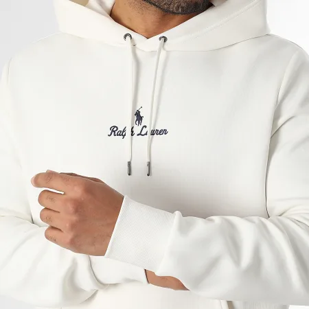 Hanorac original Ralph Lauren, culoare alb cremos, cu glugă reglabilă și buzunar frontal tip cangur.
